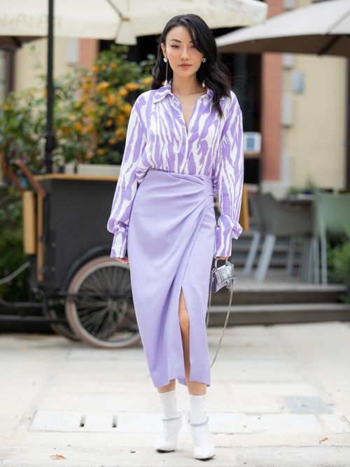 Photographed outside of the MSGM show during Milan Fashion Week, the Chinese-American influencer wore an oh-so-chic lilac and white zebra-printed blouse, a lilac midi skirt, and white booties.