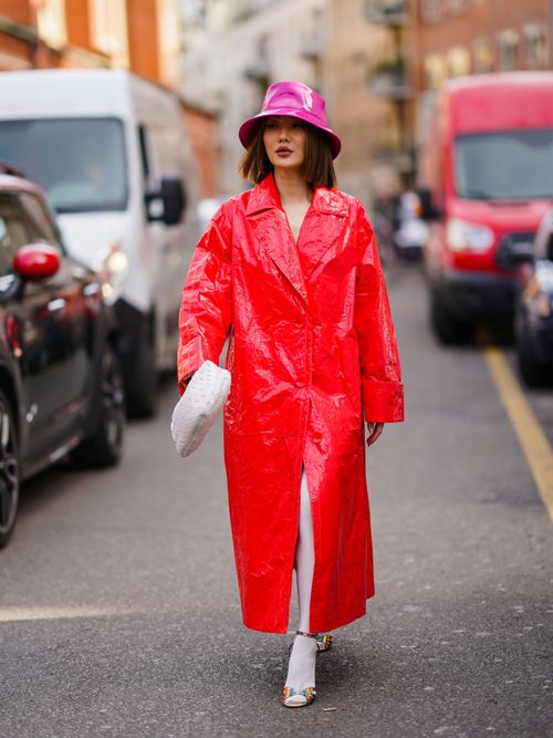 Lady in red! The mother of two made a colourful sartorial statement outside Koche x Pucci during Milan Fashion Week Fall/Winter 2020-2021 when she wore a shiny red PVC trench coat and pink-purple PVC bucket hat.