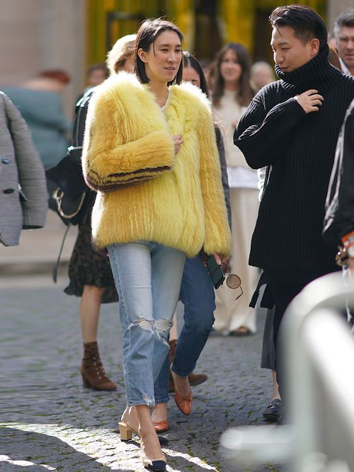 If you need to make your ripped denim look a little more statement, a standout faux fur is the way to go. Channel Eva Chen and choose a super bright shade.